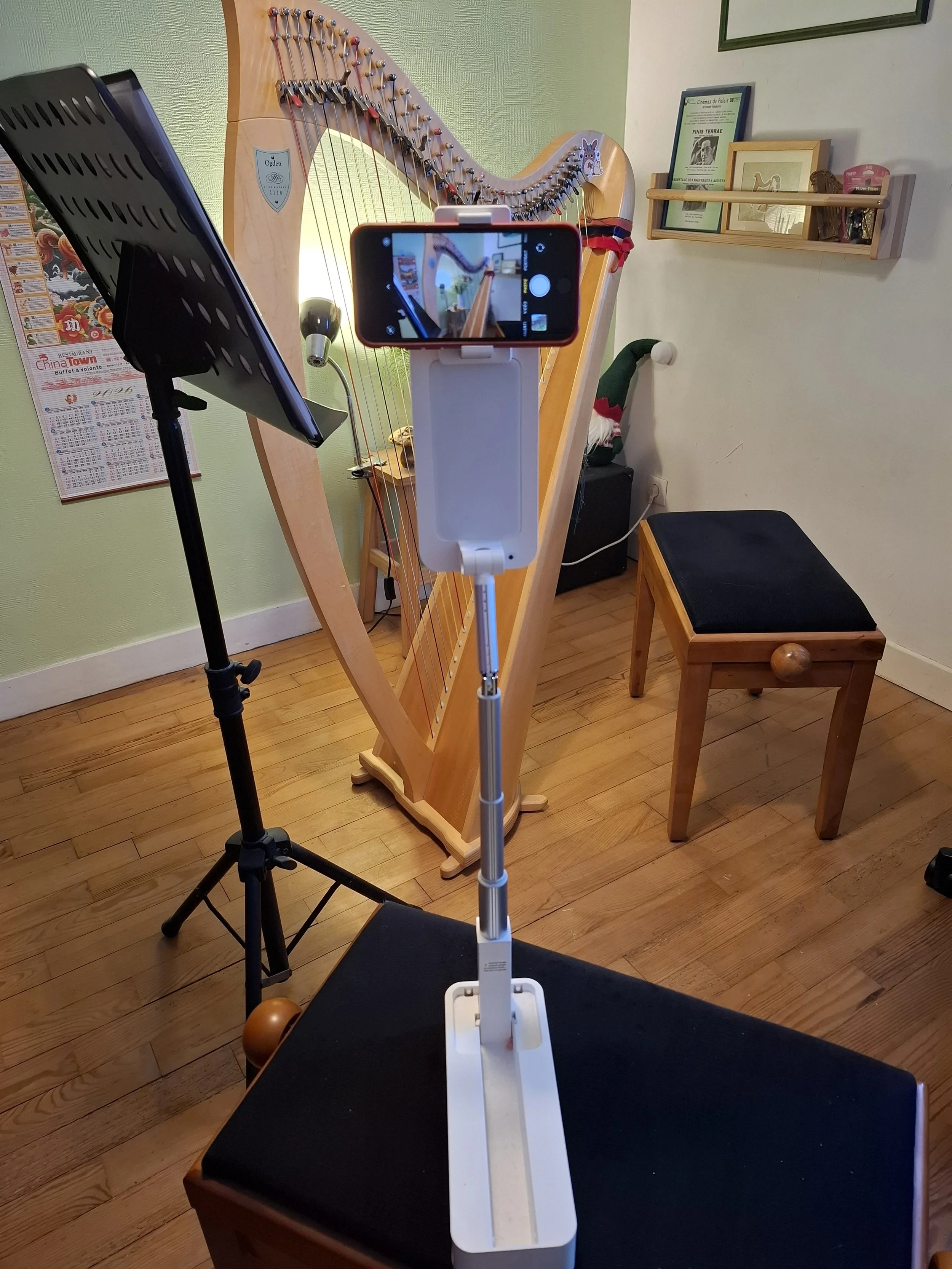 Although many people use a computer for video conferencing, a smartphone — especially an iPhone — can offer superior image quality, particularly when paired with a good mount. Properly positioned, it allows you to teach or learn with clarity and comfort while keeping your hands free to play the harp.